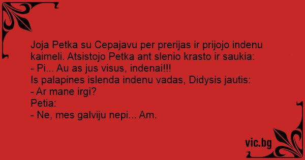 Joja Petka su Cepajavu per prerijas ir prijojo indenu kaimeli. Atsistojo Petka ant slenio krasto ir saukia: