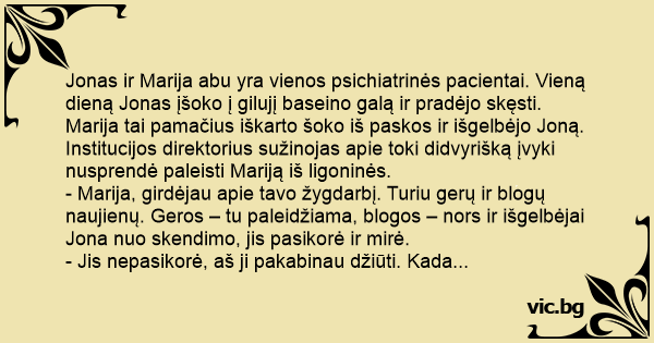 Jonas ir Marija abu yra vienos psichiatrinės pacientai. Vieną dieną Jonas įšoko į gilujį baseino galą ir pradėjo skęsti. Marija tai pamačius iškarto šoko iš paskos ir išgelbėjo Joną.