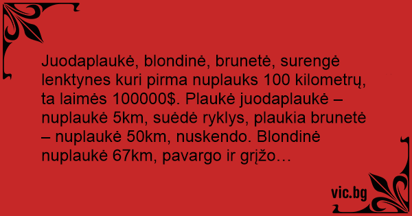 Juodaplaukė, blondinė, brunetė, surengė lenktynes kuri pirma nuplauks 100 kilometrų, ta laimės 100000$. Plaukė juodaplaukė – nuplaukė 5km, suėdė ryklys, plaukia brunetė – nuplaukė 50km, nuskendo. Blondinė nuplaukė 67km, pavargo ir grįžo…