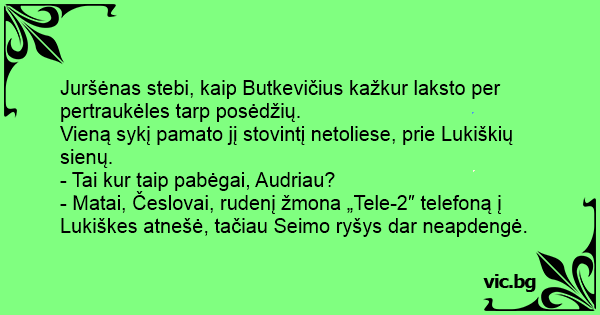 - Matai, Česlovai, rudenį žmona „Tele-2″ telefoną į Lukiškes atnešė, tačiau Seimo ryšys dar neapdengė.
