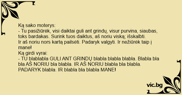 - TU blablabla GULI ANT GRINDŲ blabla blabla blabla. Blabla bla bla AŠ NORIU bla blabla. IR AŠ NORIU blabla bla blabla. PADARYK blabla. IR blabla bla blabla MANE!
