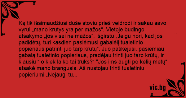 Ką tik išsimaudžiusi duše stoviu prieš veidrodį ir sakau savo vyrui „mano krūtys yra per mažos“. Vietoje būdingo atsakymo „jos visai ne mažos“, išgirstu „Jeigu nori, kad jos padidėtų, turi kasdien pasiėmusi gabalėlį tualetinio popieriaus patrinti juo tarp krūtų“. Juo patikėjusi, pasiėmiau gabalą tualetinio popieriaus, pradėjau trinti juo tarp krūtų, ir klausiu “ o kiek laiko tai truks?“ ”Jos ims augti po kelių metų“ atsakė mano brangusis. Aš nustojau trinti tualetiniu popieriumi „Nejaugi tu tikrai manai, kad tualetinis popierius gali padidinti krūtis?“ Nerodydamas nustebimo jis atsakė „Žinoma, juk užpakalis žiūrėk kaip išaugo!“