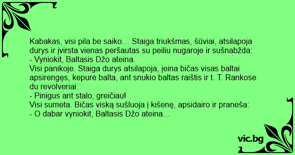 Visi panikoje. Staiga durys atsilapoja, įeina bičas visas baltai apsirengęs, kepurė balta, ant snukio baltas raištis ir t. T. Rankose du revolveriai.
