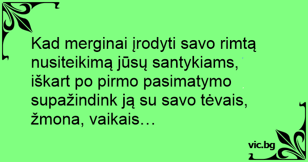 Kad merginai įrodyti savo rimtą nusiteikimą jūsų santykiams, iškart po pirmo pasimatymo supažindink ją su savo tėvais, žmona, vaikais…