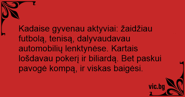 Крајот на една современа спортска кариера Преди живеех много активно Раніше я вів дуже активне життя: грав у теніс, більярд, займався шахами, брав участь в автоперегонах. Але все закінчилося коли згорів комп'ютер. Kolega żali się koledze: - Kiedyś grałem w tenisa, futbol i hokeja, czasami siadałem do szachów, lubiłem też poszaleć gokartem... - A teraz? - Niestety, teraz mój syn podrósł i już nie dopuszcza... Agrāk es spēlēju tenisu, futbolu, nodarbojos ar brīvo cīņu, piedalījos šaha un kartinga sacensībās. Viss beidzās, kad salūza dators.