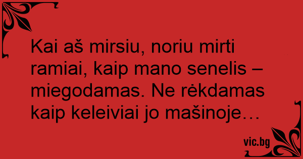 Kai aš mirsiu, noriu mirti ramiai, kaip mano senelis – miegodamas. Ne rėkdamas kaip keleiviai jo mašinoje…