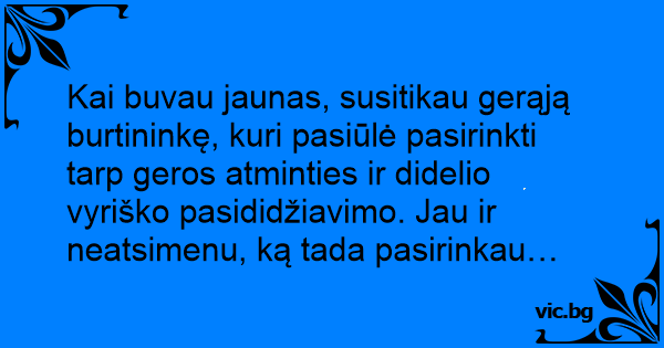 Kai buvau jaunas, susitikau gerąją burtininkę, kuri pasiūlė pasirinkti tarp geros atminties ir didelio vyriško pasididžiavimo. Jau ir neatsimenu, ką tada pasirinkau…