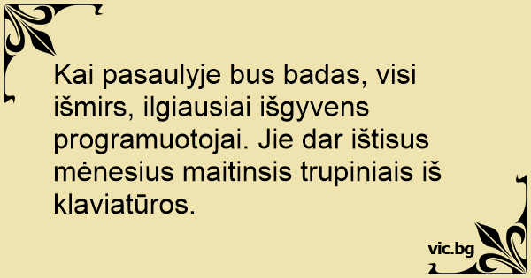 Kai pasaulyje bus badas, visi išmirs, ilgiausiai išgyvens programuotojai. Jie dar ištisus mėnesius maitinsis trupiniais iš klaviatūros.