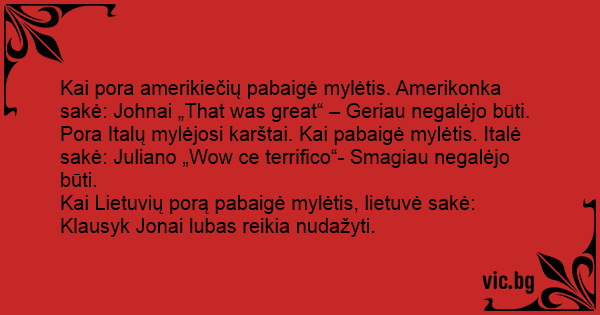 Kai Lietuvių porą pabaigė mylėtis, lietuvė sakė: Klausyk Jonai lubas reikia nudažyti.