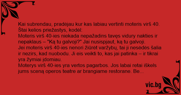 Moteris virš 40-ies niekada nepažadins tavęs vidury nakties ir nepaklaus – "Ką tu galvoji?" Jai nusispjaut, ką tu galvoji.