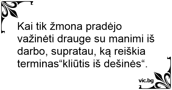 Kai tik žmona pradėjo važinėti drauge su manimi iš darbo, supratau, ką reiškia terminas“kliūtis iš dešinės“.