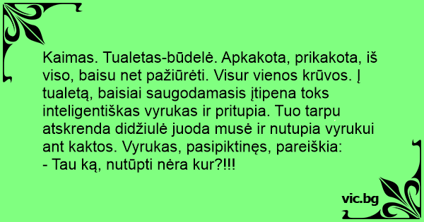 Kaimas. Tualetas-būdelė. Apkakota, prikakota, iš viso, baisu net pažiūrėti. Visur vienos krūvos. Į tualetą, baisiai saugodamasis įtipena toks inteligentiškas vyrukas ir pritupia. Tuo tarpu atskrenda didžiulė juoda musė ir nutupia vyrukui ant kaktos. Vyrukas, pasipiktinęs, pareiškia: