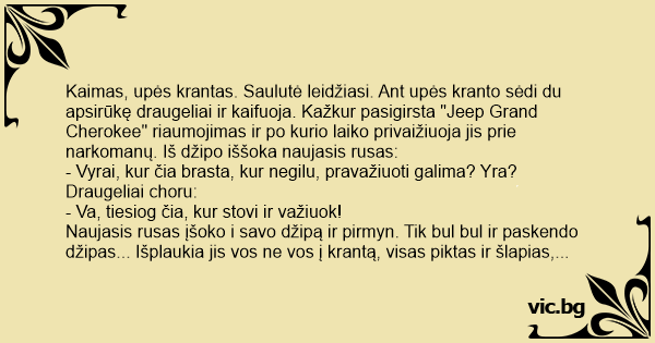 Kaimas, upės krantas. Saulutė leidžiasi. Ant upės kranto sėdi du apsirūkę draugeliai ir kaifuoja. Kažkur pasigirsta "Jeep Grand Cherokee" riaumojimas ir po kurio laiko privaižiuoja jis prie narkomanų. Iš džipo iššoka naujasis rusas: