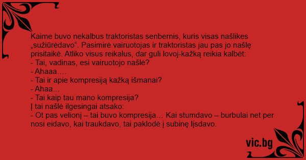 Kaime buvo nekalbus traktoristas senbernis, kuris visas našlikes „sužiūrėdavo“. Pasimirė vairuotojas ir traktoristas jau pas jo našlę prisitaikė. Atliko visus reikalus, dar guli lovoj-kažką reikia kalbėt: