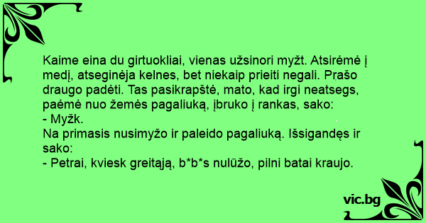 Kaime eina du girtuokliai, vienas užsinori myžt. Atsirėmė į medį, atseginėja kelnes, bet niekaip prieiti negali. Prašo draugo padėti. Tas pasikrapštė, mato, kad irgi neatsegs, paėmė nuo žemės pagaliuką, įbruko į rankas, sako: