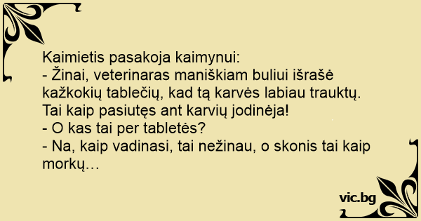 - Žinai, veterinaras maniškiam buliui išrašė kažkokių tablečių, kad tą karvės labiau trauktų.