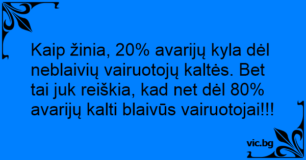 Kaip žinia, 20% avarijų kyla dėl neblaivių vairuotojų kaltės. Bet tai juk reiškia, kad net dėl 80% avarijų kalti blaivūs vairuotojai!!!
