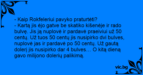 - Kartą jis ėjo gatve be skatiko kišenėje ir rado bulvę. Jis ją nuplovė ir pardavė praeiviui už 50 centų. Už tuos 50 centų jis nusipirko dvi bulves, nuplovė jas ir pardavė po 50 centų. Už gautą dolerį jis nusipirko dar 4 bulves… O kitą dieną gavo milijono dolerių palikimą.