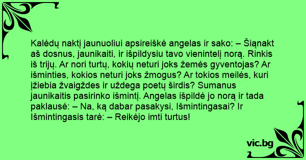 Kalėdų naktį jaunuoliui apsireiškė angelas ir sako: – Šiąnakt aš dosnus, jaunikaiti, ir išpildysiu tavo vienintelį norą. Rinkis iš trijų. Ar nori turtų, kokių neturi joks žemės gyventojas? Ar išminties, kokios neturi joks žmogus? Ar tokios meilės, kuri įžiebia žvaigždes ir uždega poetų širdis? Sumanus jaunikaitis pasirinko išmintį. Angelas išpildė jo norą ir tada paklausė: – Na, ką dabar pasakysi, Išmintingasai? Ir Išmintingasis tarė: – Reikėjo imti turtus!