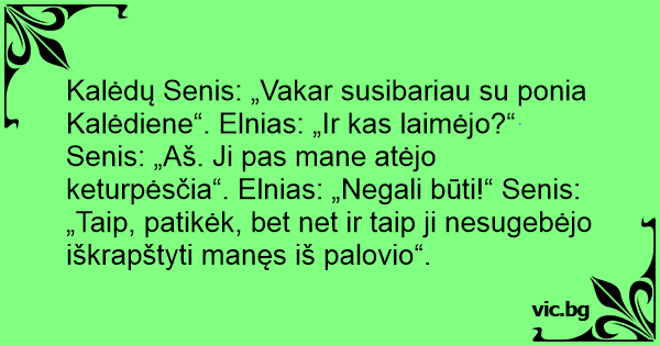 Kalėdų Senis: „Vakar susibariau su ponia Kalėdiene“. Elnias: „Ir kas laimėjo?“ Senis: „Aš. Ji pas mane atėjo keturpėsčia“. Elnias: „Negali būti!“ Senis: „Taip, patikėk, bet net ir taip ji nesugebėjo iškrapštyti manęs iš palovio“.
