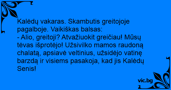- Alio, greitoji? Atvažiuokit greičiau! Mūsų tėvas išprotėjo! Užsivilko mamos raudoną chalatą, apsiavė veltinius, užsidėjo vatinę barzdą ir visiems pasakoja, kad jis Kalėdų Senis!