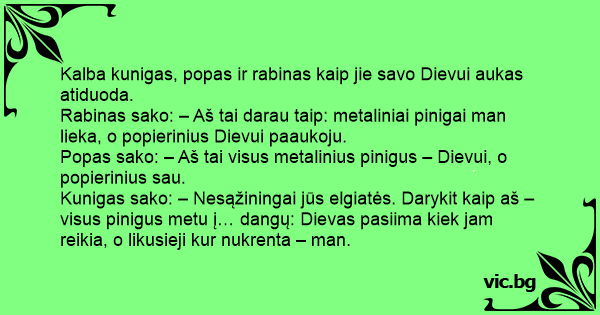 Kunigas sako: – Nesąžiningai jūs elgiatės. Darykit kaip aš – visus pinigus metu į… dangų: Dievas pasiima kiek jam reikia, o likusieji kur nukrenta – man.