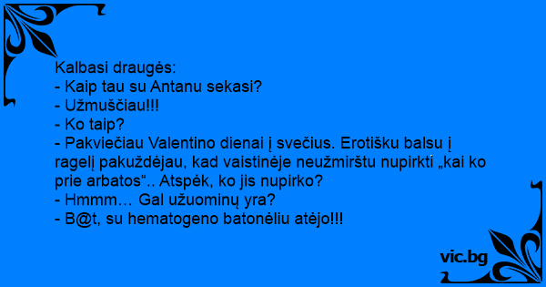 - Pakviečiau Valentino dienai į svečius. Erotišku balsu į ragelį pakuždėjau, kad vaistinėje neužmirštu nupirkti „kai ko prie arbatos“.. Atspėk, ko jis nupirko?