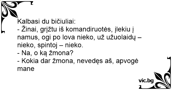 - Žinai, grįžtu iš komandiruotės, įlekiu į namus, ogi po lova nieko, už užuolaidų – nieko, spintoj – nieko.