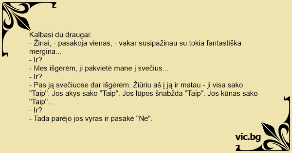 - Pas ją svečiuose dar išgėrėm. Žiūriu aš į ją ir matau - ji visa sako "Taip". Jos akys sako "Taip". Jos lūpos šnabžda "Taip". Jos kūnas sako "Taip"...