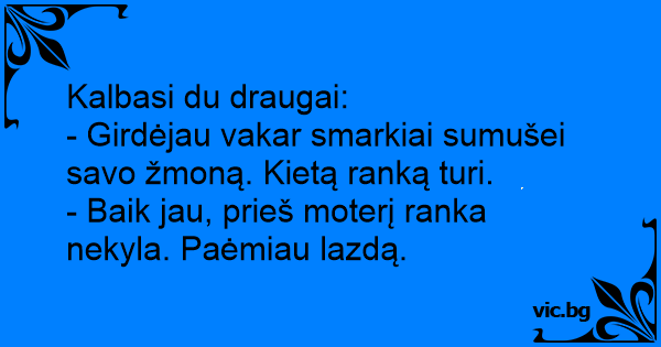 - Girdėjau vakar smarkiai sumušei savo žmoną. Kietą ranką turi.