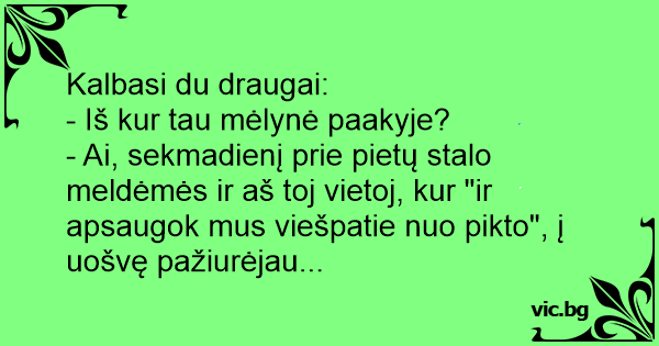 - Ai, sekmadienį prie pietų stalo meldėmės ir aš toj vietoj, kur "ir apsaugok mus viešpatie nuo pikto", į uošvę pažiurėjau...