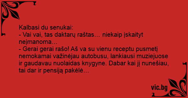 - Gerai gerai rašo! Aš va su vienu receptu pusmetį nemokamai važinėjau autobusu, lankiausi muziejuose ir gaudavau nuolaidas knygyne. Dabar kai jį nunešiau, tai dar ir pensiją pakėlė…