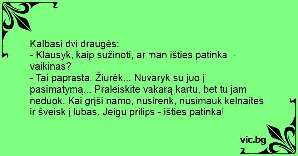 - Tai paprasta. Žiūrėk... Nuvaryk su juo į pasimatymą... Praleiskite vakarą kartu, bet tu jam neduok. Kai grįši namo, nusirenk, nusimauk kelnaites ir šveisk į lubas. Jeigu prilips - išties patinka!