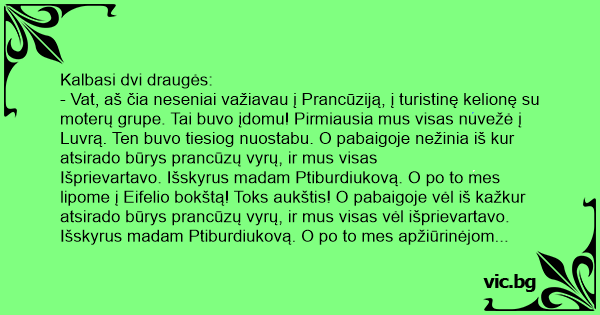 - Vat, aš čia neseniai važiavau į Prancūziją, į turistinę kelionę su moterų grupe. Tai buvo įdomu! Pirmiausia mus visas nuvežė į Luvrą. Ten buvo tiesiog nuostabu. O pabaigoje nežinia iš kur atsirado būrys prancūzų vyrų, ir mus visas