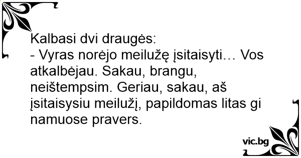 - Vyras norėjo meilužę įsitaisyti… Vos atkalbėjau. Sakau, brangu, neištempsim. Geriau, sakau, aš įsitaisysiu meilužį, papildomas litas gi namuose pravers.