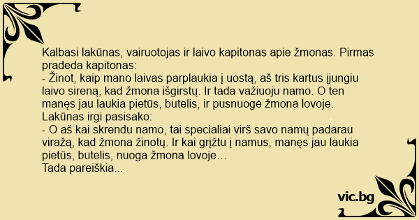 - Žinot, kaip mano laivas parplaukia į uostą, aš tris kartus įjungiu laivo sireną, kad žmona išgirstų. Ir tada važiuoju namo. O ten manęs jau laukia pietūs, butelis, ir pusnuogė žmona lovoje.