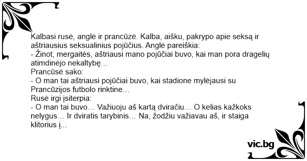 Kalbasi rusė, anglė ir prancūzė. Kalba, aišku, pakrypo apie seksą ir aštriausius seksualinius pojūčius. Anglė pareiškia: