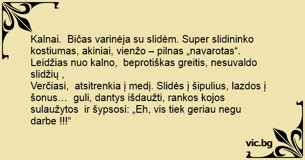 Verčiasi, atsitrenkia į medį. Slidės į šipulius, lazdos į šonus… guli, dantys išdaužti, rankos kojos sulaužytos ir šypsosi: „Eh, vis tiek geriau negu darbe !!!“