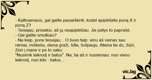 - Na kaip, pone teisėjau... O buvo taip: einu aš vienas sau ramiai, miškeliu, diena graži, šilta, švilpauju. Ateina tie du, žiūri, žiūri į mane ir po to sako: