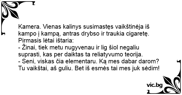 - Žinai, tiek metu nugyvenau ir lig šiol negaliu suprasti, kas per daiktas ta reliatyvumo teorija.