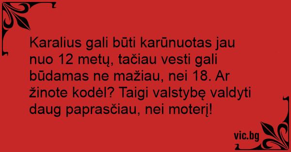 Karalius gali būti karūnuotas jau nuo 12 metų, tačiau vesti gali būdamas ne mažiau, nei 18. Ar žinote kodėl? Taigi valstybę valdyti daug paprasčiau, nei moterį!