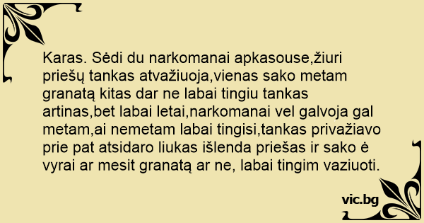 Karas. Sėdi du narkomanai apkasouse,žiuri priešų tankas atvažiuoja,vienas sako metam granatą kitas dar ne labai tingiu tankas artinas,bet labai letai,narkomanai vel galvoja gal metam,ai nemetam labai tingisi,tankas privažiavo prie pat atsidaro liukas išlenda priešas ir sako ė vyrai ar mesit granatą ar ne, labai tingim vaziuoti.