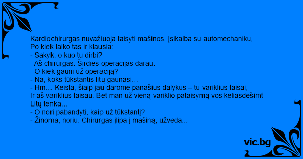 Kardiochirurgas nuvažiuoja taisyti mašinos. Įsikalba su automechaniku,