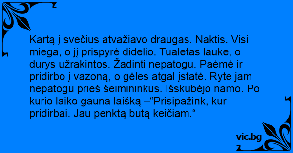 Kartą į svečius atvažiavo draugas. Naktis. Visi miega, o jį prispyrė didelio. Tualetas lauke, o durys užrakintos. Žadinti nepatogu. Paėmė ir pridirbo į vazoną, o gėles atgal įstatė. Ryte jam nepatogu prieš šeimininkus. Išskubėjo namo. Po kurio laiko gauna laišką –“Prisipažink, kur pridirbai. Jau penktą butą keičiam.“