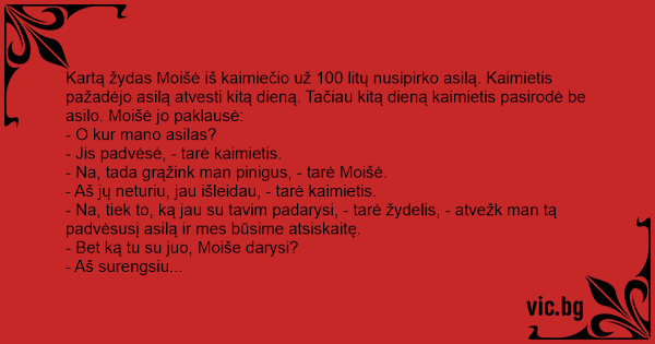 Kartą žydas Moišė iš kaimiečio už 100 litų nusipirko asilą. Kaimietis pažadėjo asilą atvesti kitą dieną. Tačiau kitą dieną kaimietis pasirodė be asilo. Moišė jo paklausė: