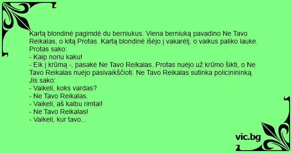 Kartą blondinė pagimdė du berniukus. Viena berniuką pavadino Ne Tavo Reikalas, o kitą Protas. Kartą blondinė išėjo į vakarėlį, o vaikus paliko lauke. Protas sako: