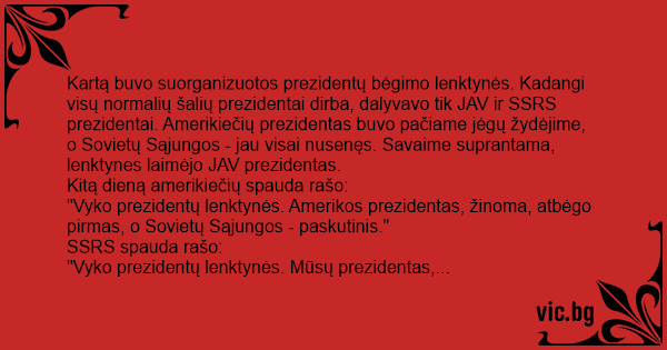 Kartą buvo suorganizuotos prezidentų bėgimo lenktynės. Kadangi visų normalių šalių prezidentai dirba, dalyvavo tik JAV ir SSRS prezidentai. Amerikiečių prezidentas buvo pačiame jėgų žydėjime, o Sovietų Sąjungos - jau visai nusenęs. Savaime suprantama, lenktynes laimėjo JAV prezidentas.