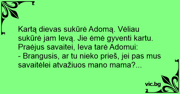 Kartą dievas sukūrė Adomą. Vėliau sukūrė jam Ievą. Jie ėmė gyventi kartu. Praėjus savaitei, Ieva tarė Adomui: