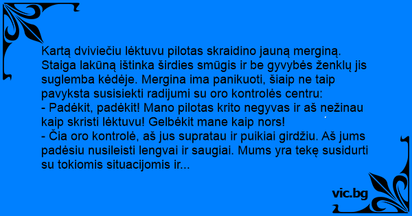 - Padėkit, padėkit! Mano pilotas krito negyvas ir aš nežinau kaip skristi lėktuvu! Gelbėkit mane kaip nors!