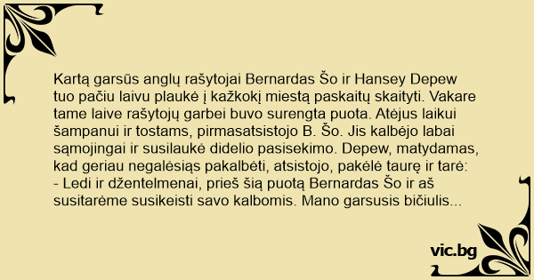 Kartą garsūs anglų rašytojai Bernardas Šo ir Hansey Depew tuo pačiu laivu plaukė į kažkokį miestą paskaitų skaityti. Vakare tame laive rašytojų garbei buvo surengta puota. Atėjus laikui šampanui ir tostams, pirmasatsistojo B. Šo. Jis kalbėjo labai sąmojingai ir susilaukė didelio pasisekimo. Depew, matydamas, kad geriau negalėsiąs pakalbėti, atsistojo, pakėlė taurę ir tarė:
